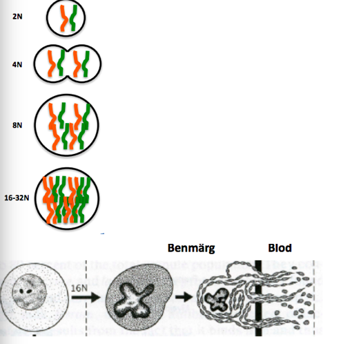 En trombocyt bildas igenom att en Megakaryocyte-erytjrpid progenitor (MkE) får IL-3 och GM-CSF è Megakaryoyte. Detta sker igenom endomitos delning – vilket är celldelning fast utan cytokines där cellerna delas. Så vi får alltså en jättestor cell med 16-32 uppsättningar DNA. När denna i benmärgen försöker tränga sig igenom kanaler i endotelet så splittras den till massa blodplättar som går ut i blodet.