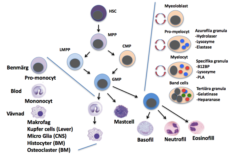 Kan bildas utifrån både CMP och LMPP som båda gör GMP, Granulcyte-macrophage progenitor. è blir sedan granulocyt eller makrofager.