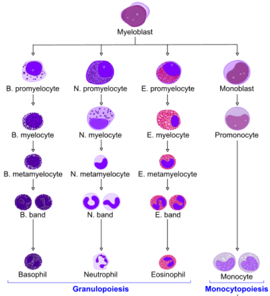 hur utvecklass vi i från myeloblast till de olika granulocyterna? varje mellansteg. Ej vilka granula som är där.