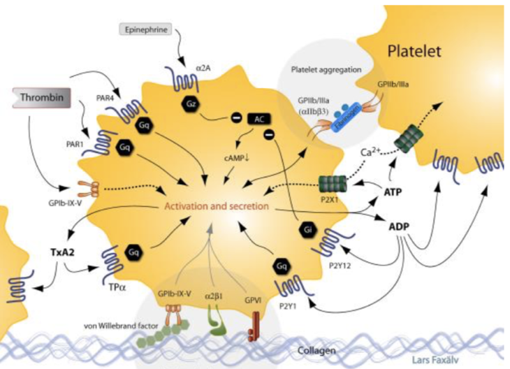Runt om i blodkärlet ovanför skadan så finns det blodplättar som cirkulerar. ADP och TxA2 stimulera dessa plättar så de aktiveras och åker till skadan. Detta kallas platelet aggregation.