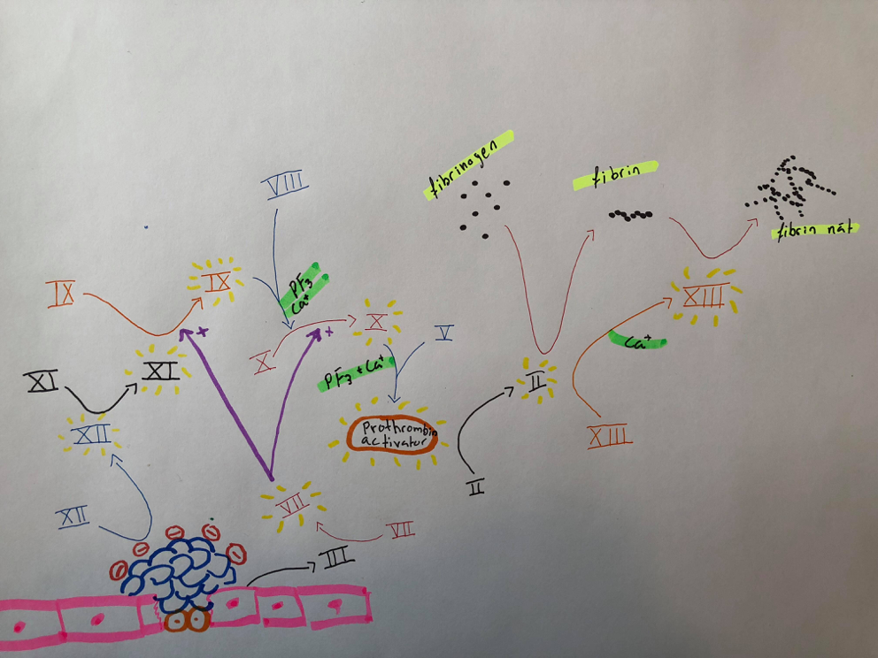 När denna del börjar så har vi en skada på endotel, kollagen, muskelceller. Vi har plättar som har bundit fast till vWf och sedan skapat en plugg runt skadan. Vi vill hålla kvar denna pluggen och inte att den ”flyter iväg”. Det finns 3 pathways som styr detta, de är Intrinsic, Extrinsic och sedan Common.