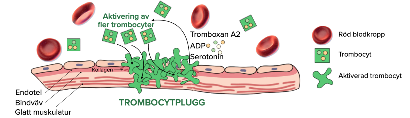 Vid kärlskada kan trombocyter binda till kollagen i kärlväggen med hjälp av von Willenbrand faktor. I samband med detta blir trombocyten aktiverad vilket innebär att den ändrar form och frisätter bland annat ADP och tromboxan A2. Frisatt ADP kommer att binda till närliggande trombocyter med hjälp av receptorer för ADP. Detta kommer i sin tur att aktivera GPIIb/IIIa (fibrinogen-receptorer). Till detta glykoprotein kan sedan fibrinogen binda. På så vis kan trombocyterna klumpas samman och bilda en trombocytplugg.