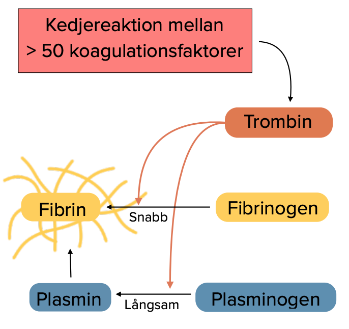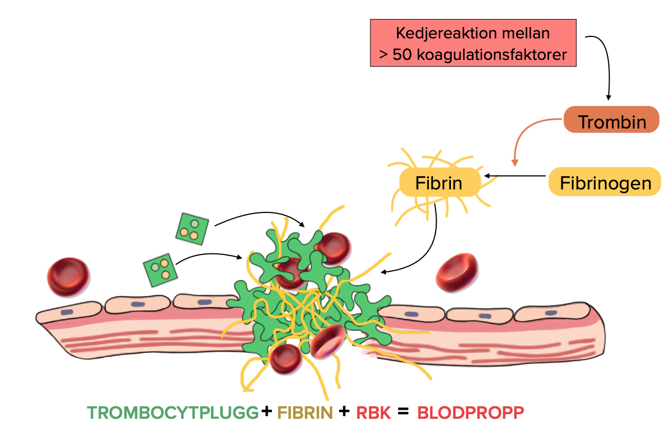 Koagulation är en komplicerad kedjereaktion som involverar över femtio olika koagulationsfaktorer, men slutet av kedjereaktionerna är ett ämne som heter trombin. Trombin ombildar fibrinogen till ett nätverk av fibrintrådar som förstärker trombocytpluggen och bildar en blodpropp (trombos). En blodpropp består av en trombocytplugg som är stärkt med fibrin och innehåller röda blodkroppar som fångats i nätet.