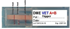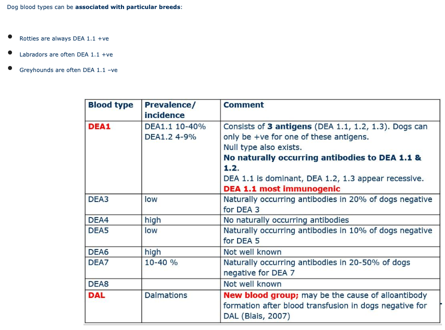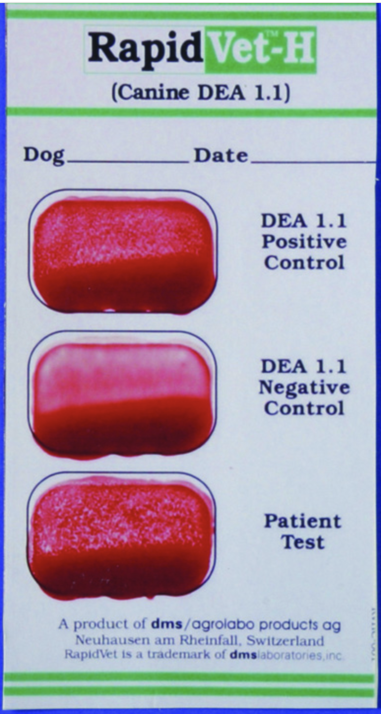 dogs have a number of different blood types but pen side tests (snap test/cards) only test if the dog is blood type DEA1.1 (dog erythrocyte antigen)