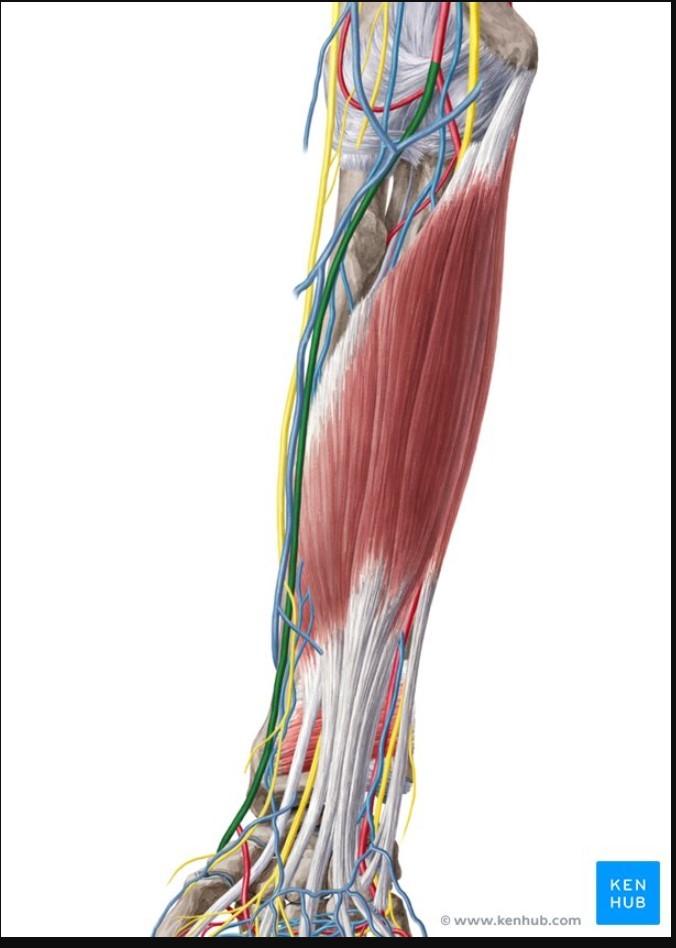 the extension of the axillary artery starting at the lower margin of the teres major muscle and is the major artery of the upper extremity. The brachial artery courses along the ventral surface of the arm and gives rise to multiple smaller branching arteries before reaching the cubital fossa