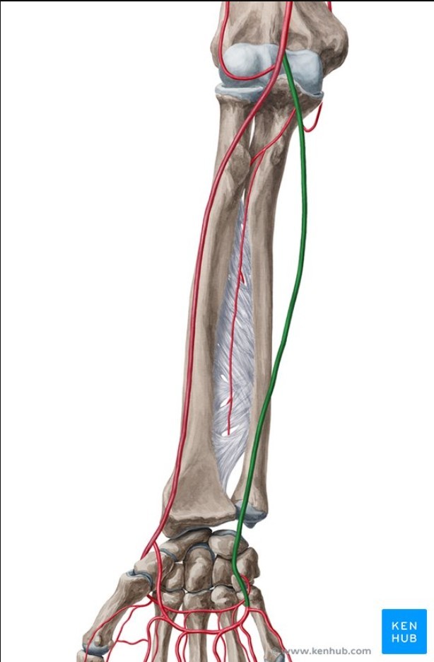 a terminal branch of the brachial artery and arises at the cubital fossa of the forearm. It is one of the two main arteries of the forearm, along with the ulnar artery.