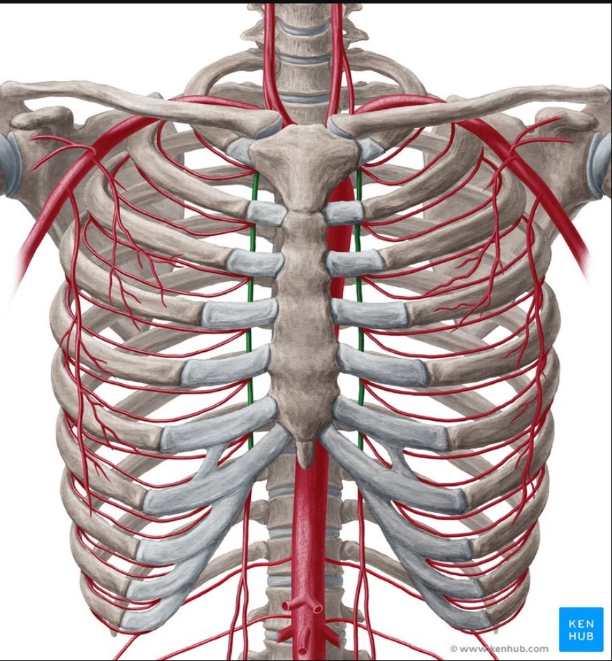 supplies the breast and the anterior chest wall. The internal thoracic artery travels along the inner surface of the anterior chest wall on both sides