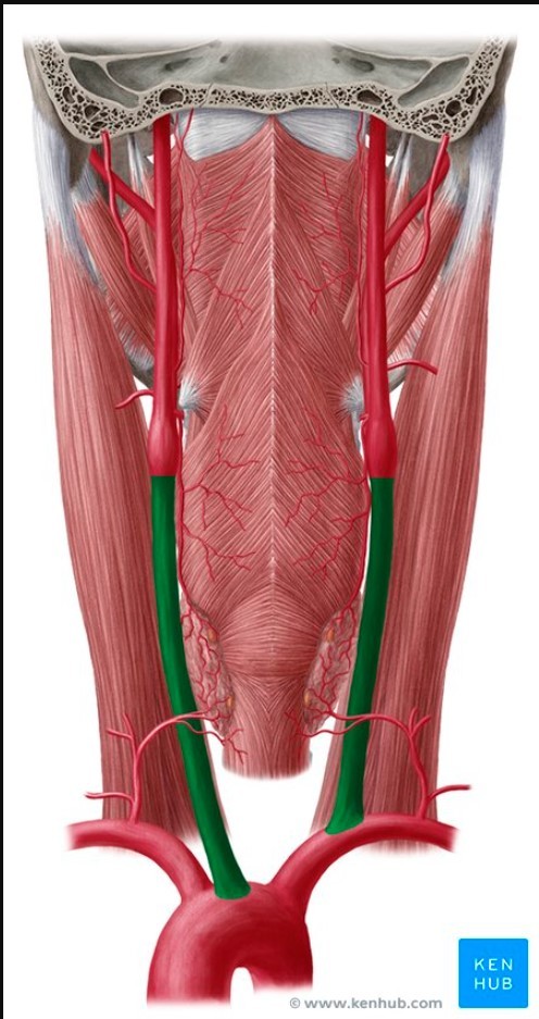 a major branch of the common carotid artery, supplying several parts of the head with blood, the most important one being the brain. There are two internal carotid arteries in total, one on each side of the neck.