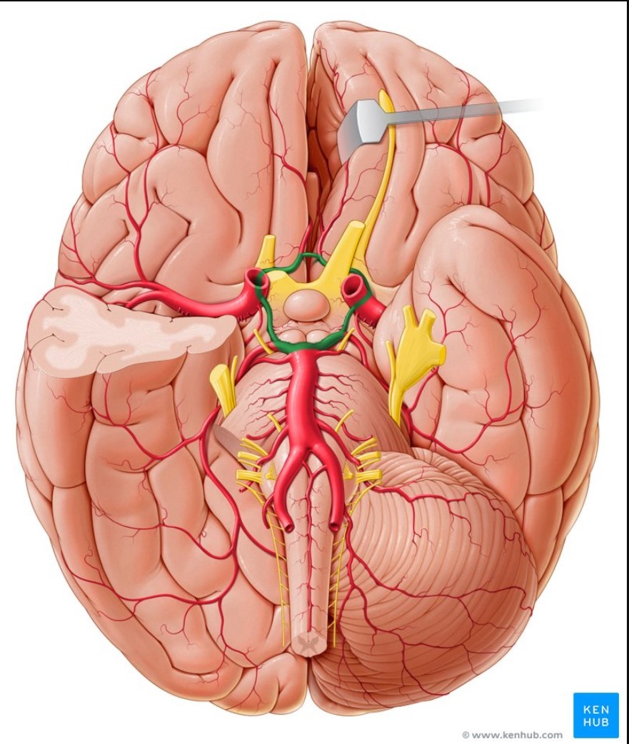 joining area of several arteries at the bottom (inferior) side of the brain. At the Circle of Willis, the internal carotid arteries branch into smaller arteries that supply oxygenated blood to over 80% of the cerebrum