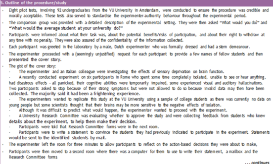All participants were debriefed and fully informed consent was gained after the research. Participants were given a written debriefing form that outlined the reason for the fake cover story, as well as an email address to contact in case they wanted to complain or ask further questions about the study. During the debrief they made sure that participants did not feel uncomfortable about their obedience and about the fact they had been deceived