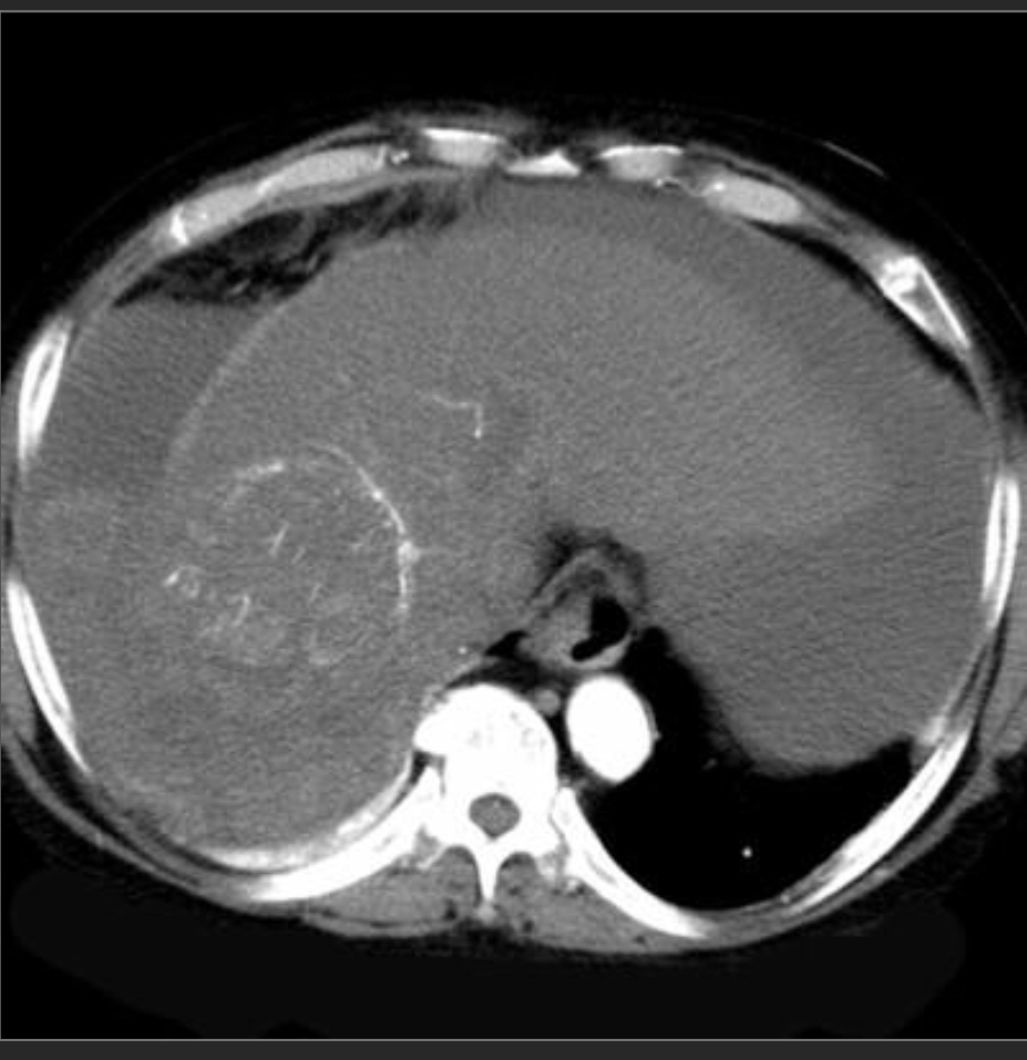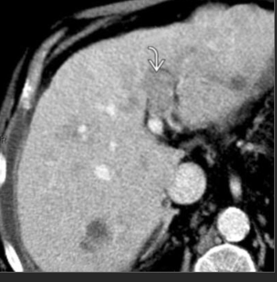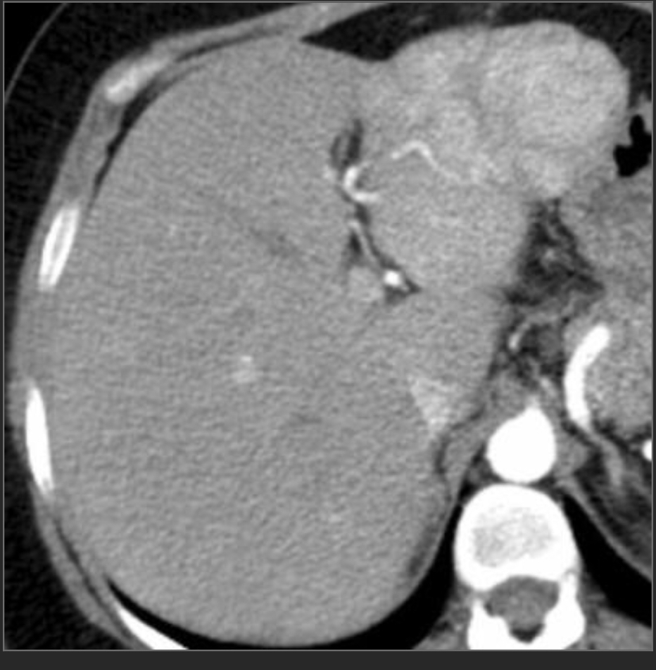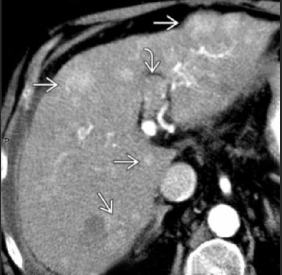 Arterial phase CECT w/multiple hyperdense/hypervascular foci c/w tumor (these wash out on PV phase where the tumor thrombus is also more apparent) we also see cirrhosis w/small nodular border