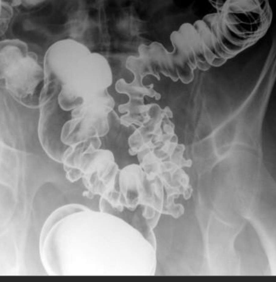 get ‘cogwheel’ narrowing of the colonic lumen