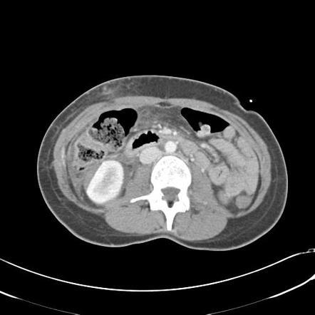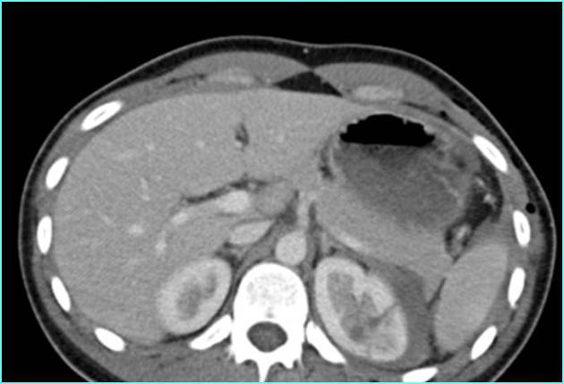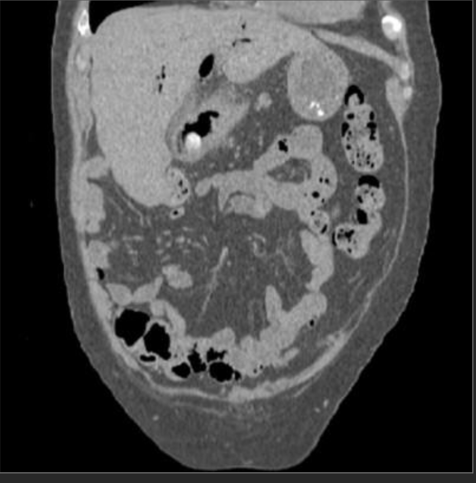 —> findings suggestive of ischemia/closed loop include minimal enhancement of the mucosa and engorged mesenteric fat/vessels, and focal ascites.