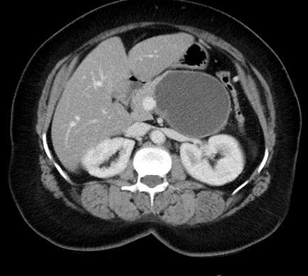 unilocular cyst with thick, crenulated walls that enhance on CT (from peripheral vessels, correlates with ring of fire on US)