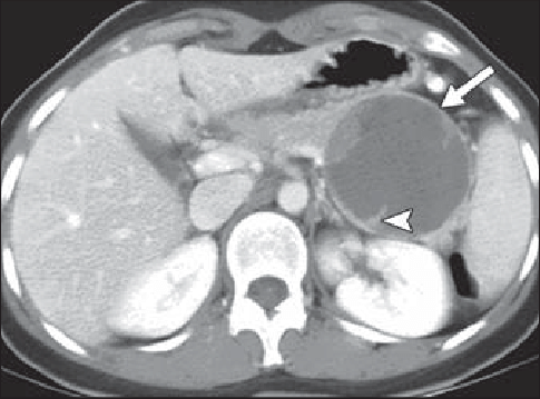 large mass with heterogeneous solid and cystic areas.Hemorrhage is typical. Has a capsule, as does mucinous cystic neoplasm.
