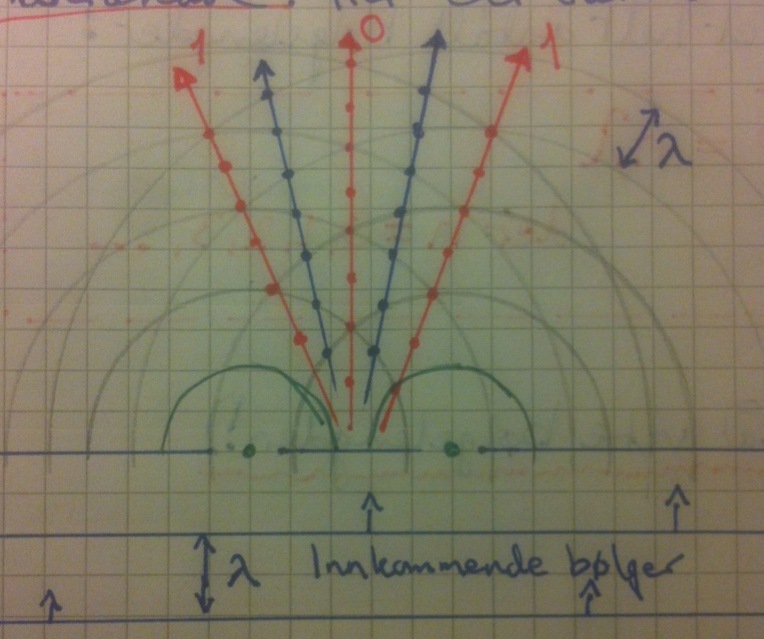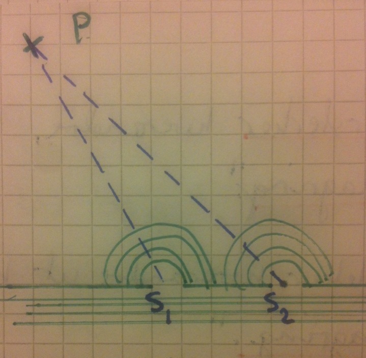 Hvis vi har to bølgekilder som lager bølger i samme fase vil vi få et spesielt interferensmønster. I noen retninger vil bølgetopp møte bølgetopp, og bølgebunn møte bølgebunn. Bølgene overlagrer, og vi får dobbelt så høye bølgetopper og dobbelt så dype bølgebunner. I andre retninger møter bølgetopp bølgebunn, og de slukker hverandre.