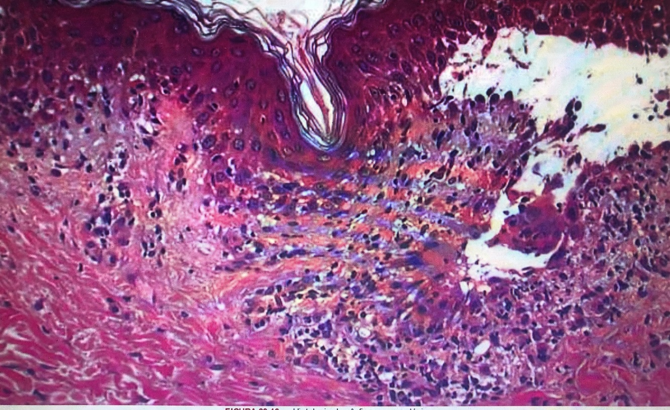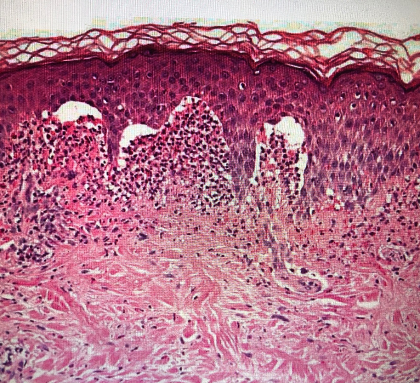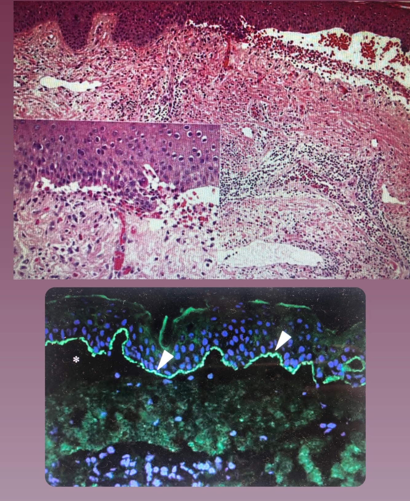 - AP: bolha subepidermica com microabscessos de neutrofilos nas papilas dermicas