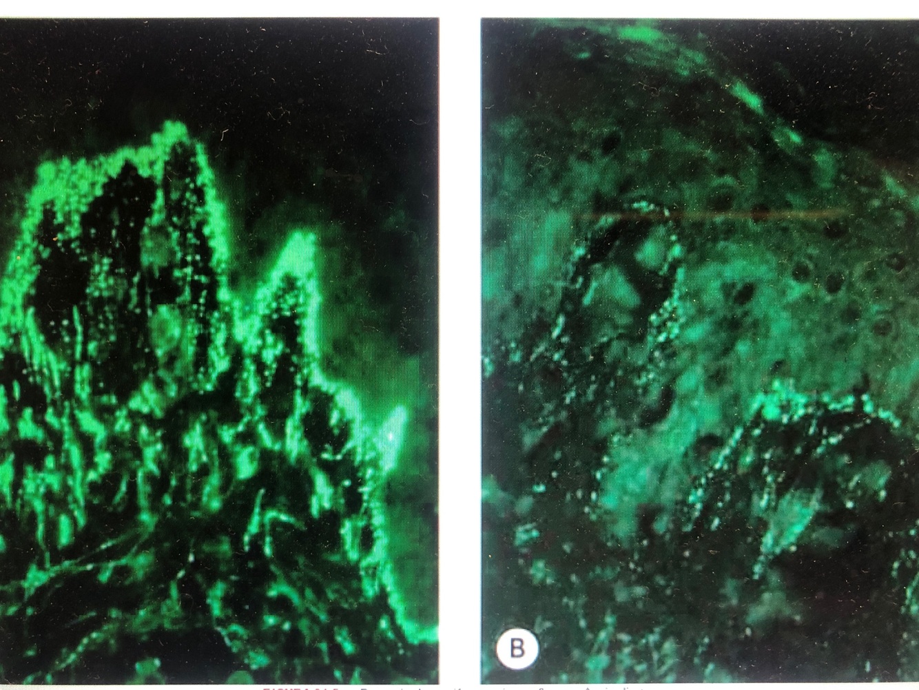 Dermatite herpetiforme (dermatite de duhring) - IFD com deposito granular de IgA na papila dermica