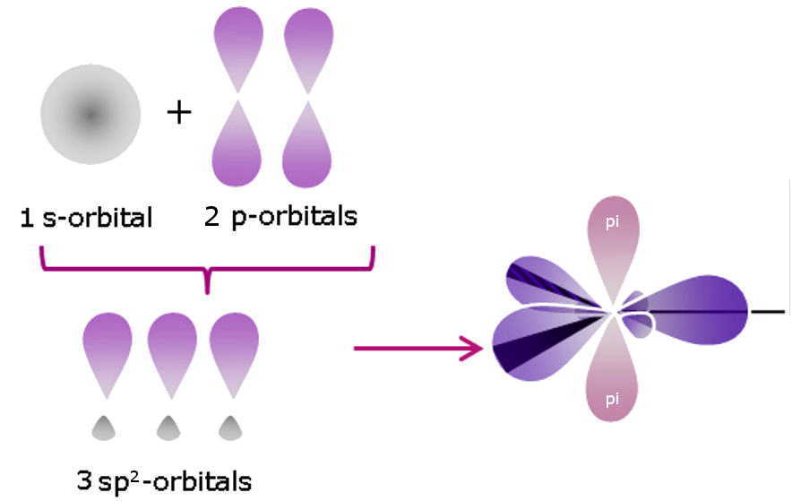 A carbon atom undergoing sp2 hybridization will form bonds to three total atoms, with a mix of two single bonds and one double bond. A classic example of this bond arrangement is methanal. For other central atoms, note that lone pairs also contribute to overall hybridization.