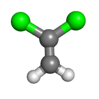 What is the shape of the atoms arranged around either of the carbon atoms in 1,1-dichloroethene (Cl2C=CH2)?