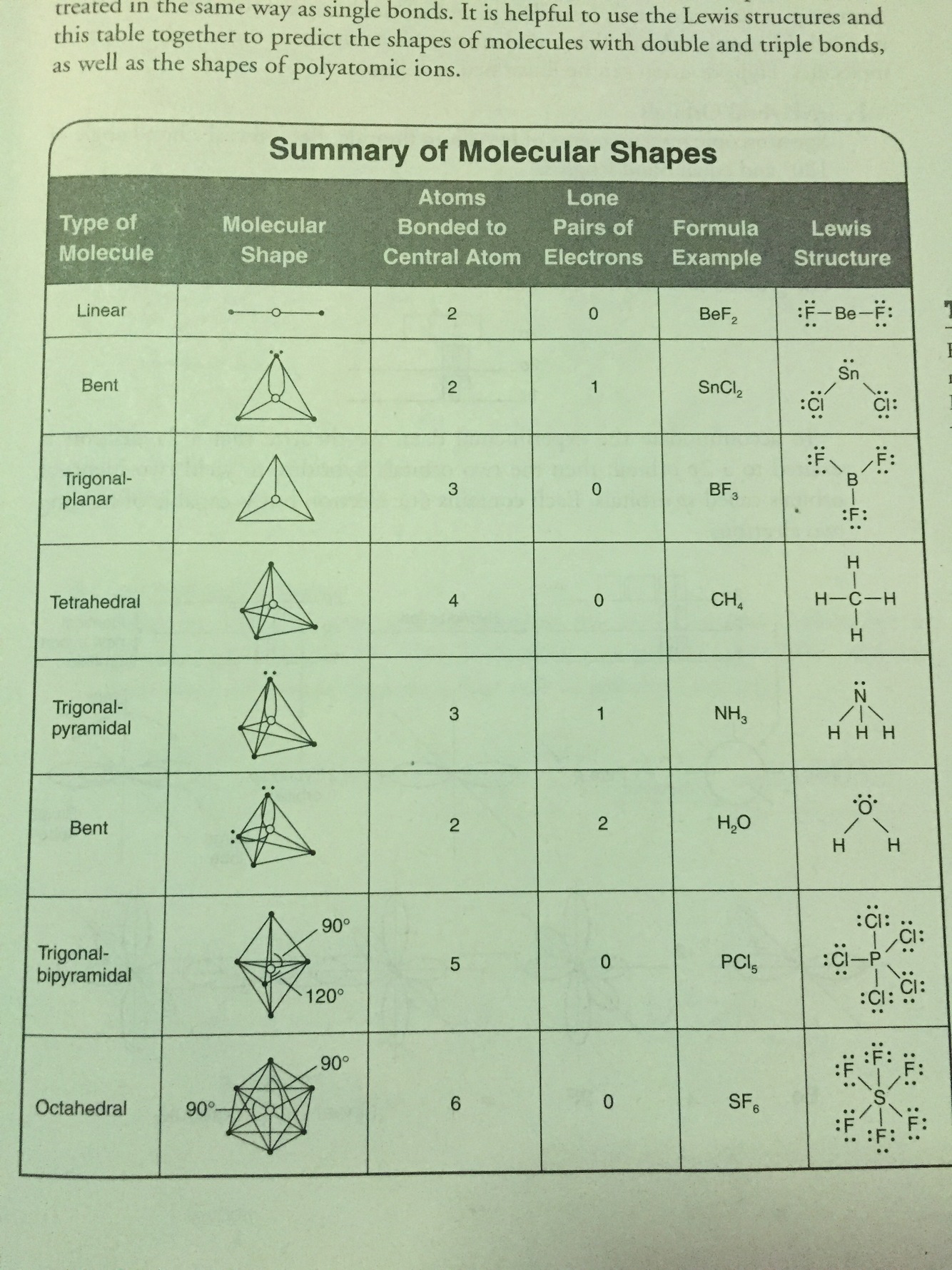 bond angles VSEPR uses as its basis that fact that like charges will orient themselves in such a way as to diminish the repulsion between them. linear arrangement: mutual repulsion of two electron clouds forces them to the opposite sides of a sphere trigonal-planar arrangment: minimum repulsion between three electron pairs occurs when the pairs are at the vertices of an equilateral triangle inscribed in a sphere tetrahedral: four electron pairs are farthest apart at the vertices of a tetrahedron inscribed in a sphere. octahedral: mutual repulsion of six identical electron clouds directs them to the corners of an inscribed regular octahedron. **lone pairs do occupy space, but our description of the observed shape of a molecule refers to the positions of atoms only.