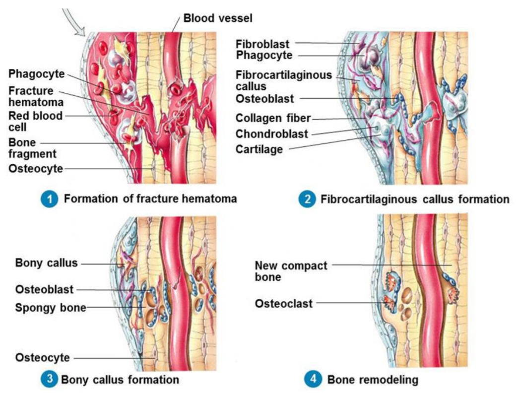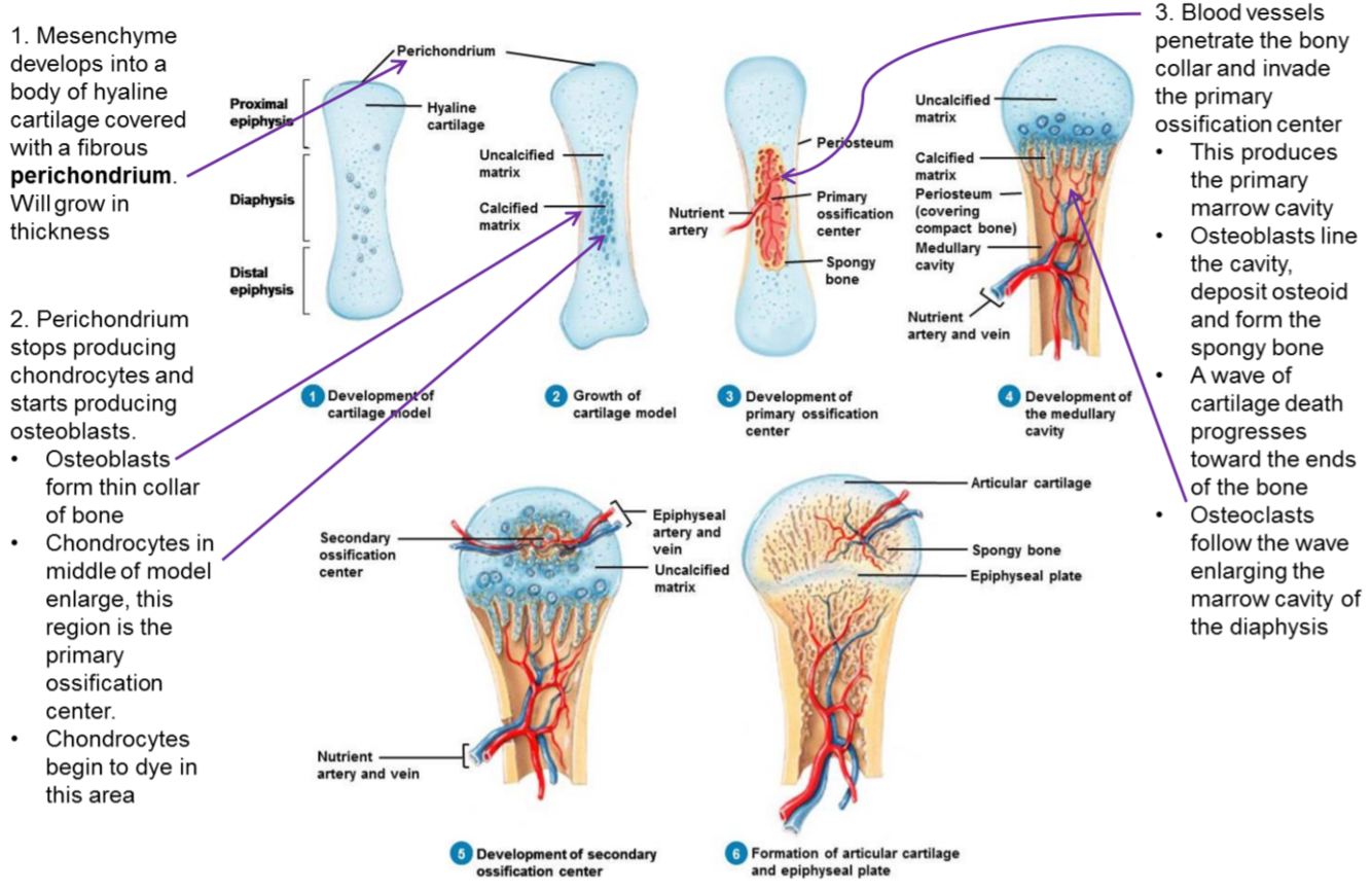 Osteoclasts resorb/remove dead chondrocytes to lengthen medullary cavity (zone of resorption)