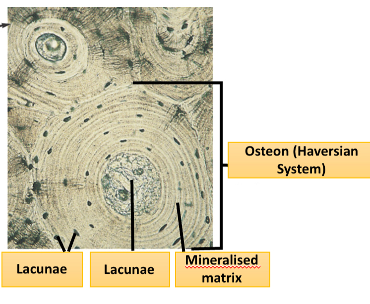 Lacunae surrounded by mineralised matrix- they all form part of the Osteon (HAVERSIAN system).