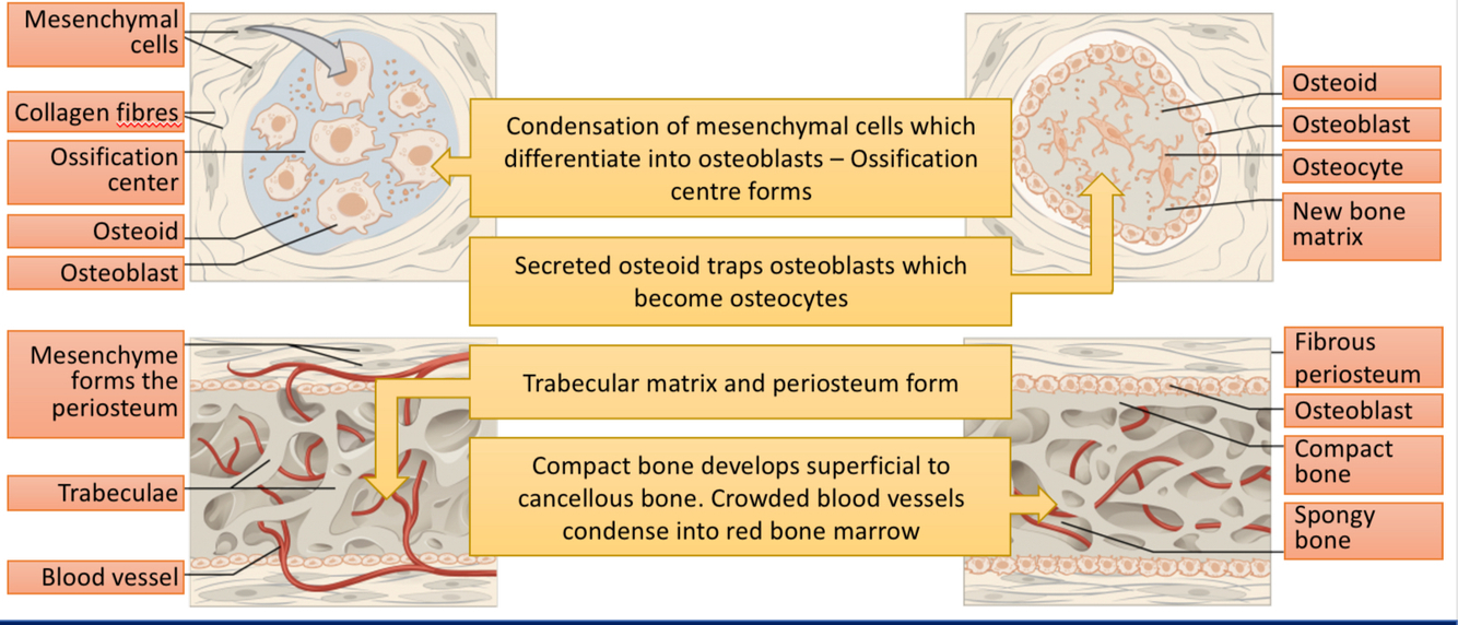 Outline the steps of intramembranous ossification