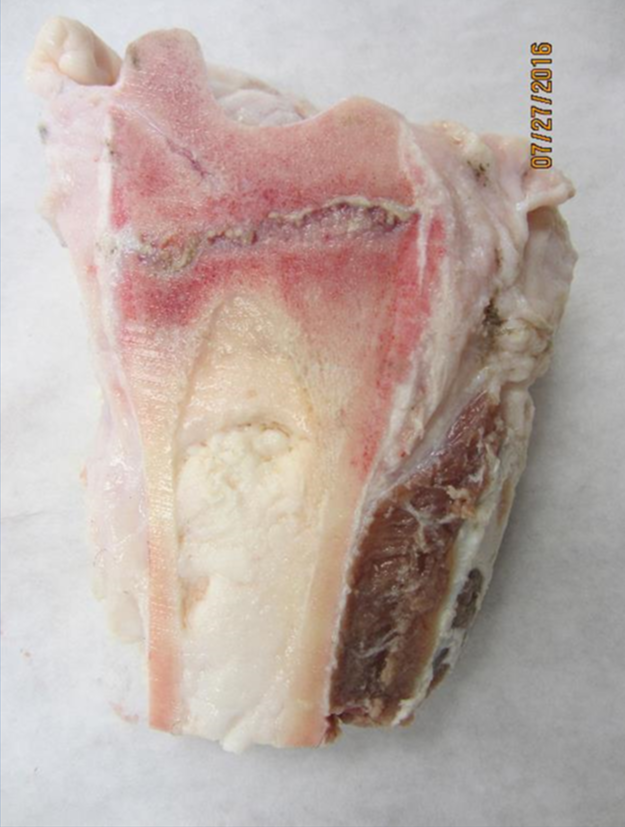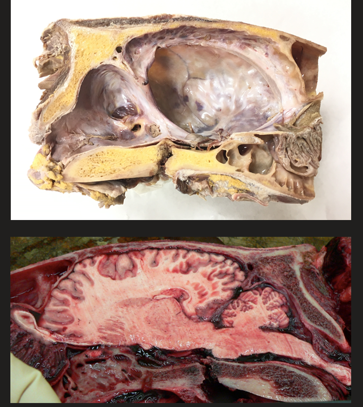 The basisphenoid/occipital articulation is irregular: the rostral fragment (basisphenoid) is displaced cranioventrally, relative to the caudal fragment (occipital bone). In addition, there are several small bone fragments free at the fracture site. There is hemorrhage dorsal and ventral to the fracture site at the insertion of the longus capitus muscle. The hemorrhage dorsally is exterior to the dura mater and compresses it