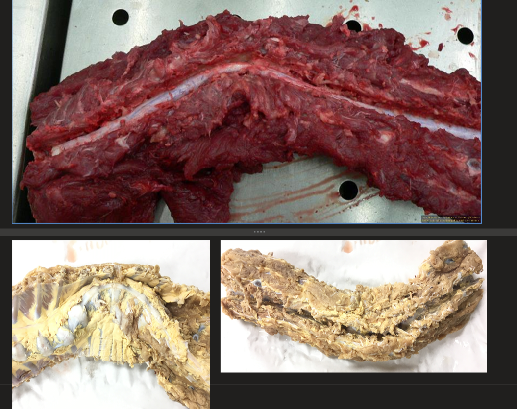 Focally, the distal thoracic portion of the spinal column is deviated laterally to the right, rotating the spine clockwise. The spinal column is narrowed by 50% at the area of lateral deviation. The spinal cord is narrowed in that area.