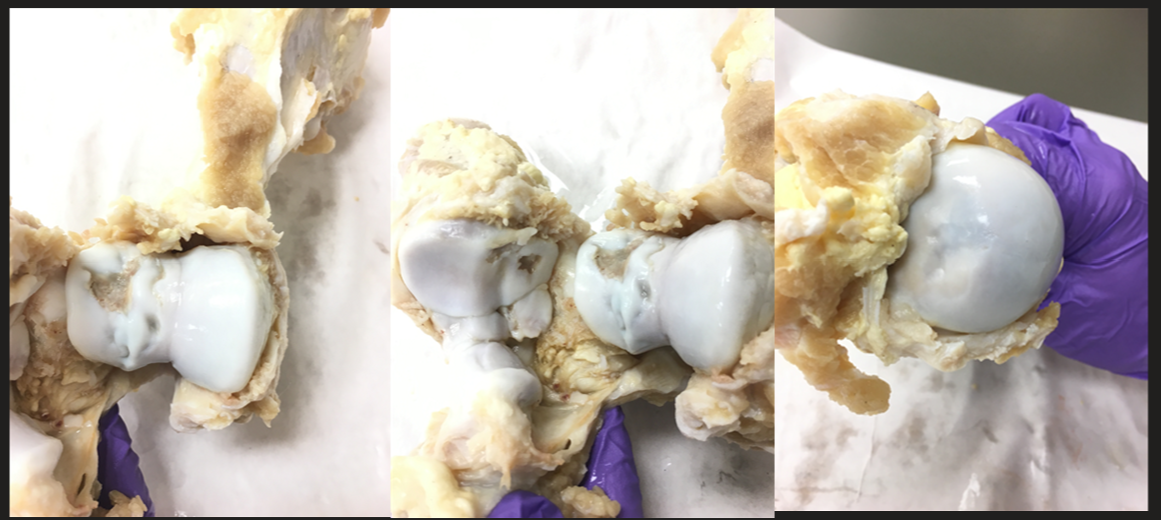 The articular cartilage of head of the humerus contains a focal cavitation measuring 2 cm x 1 cm. The articular surface of the distal end of the humerus (lateral condyle) is multifocally roughened with multiple cavitations ranging in size from 0.5 to 1 cm in diameter which have lost the articular cartilage exposing reddened subchondral bone. There are also thickened foci of cartilage that have partially separated from underlying subchondral bone. The joint capsule is thickened and fibrotic.