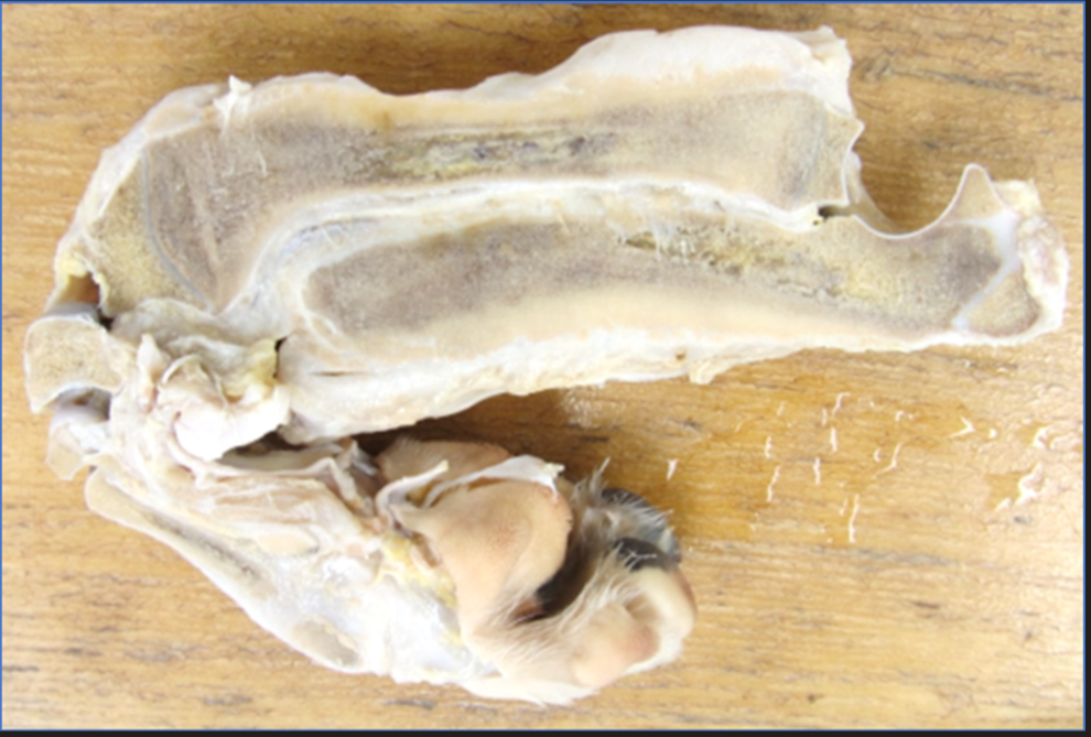 Describe this lesion. History: tissue from a finishing hog with chronic lameness.