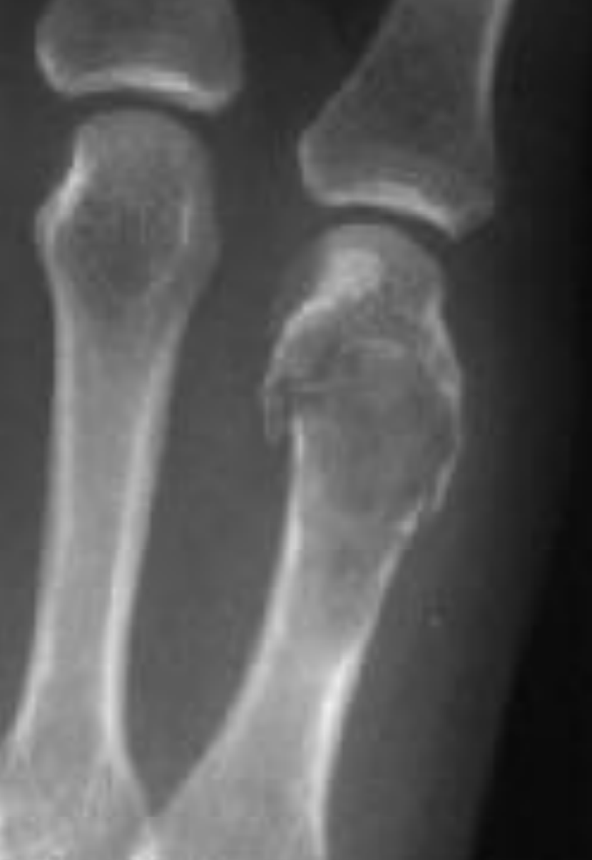 Shepherd’s crook deformity: coxa varus angulation of the proximal femur, classically seen in femoral involvement