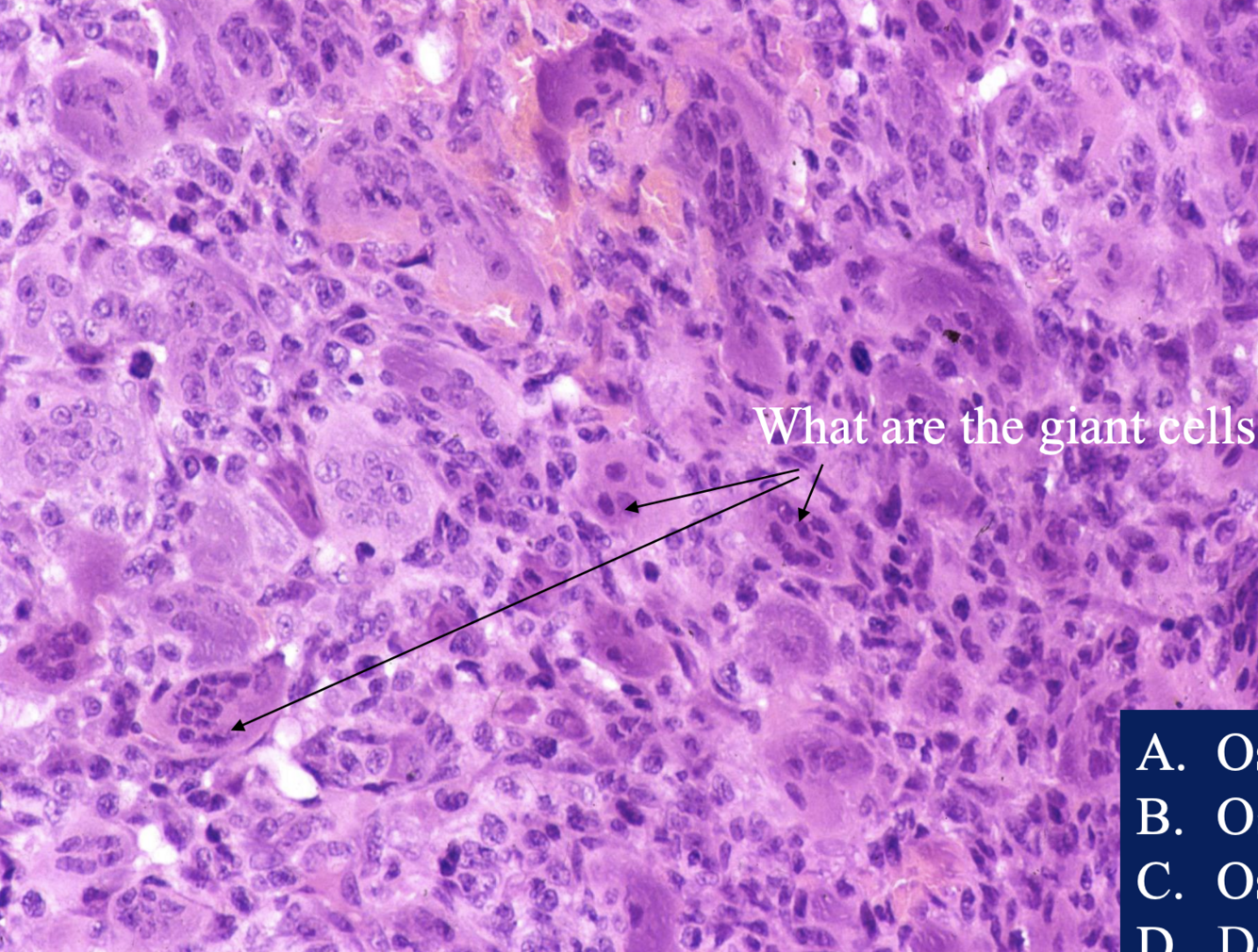 Osteoclasts and stromal cells (stromal cells are the malignant cells, but many osteoclasts giant cells seen)