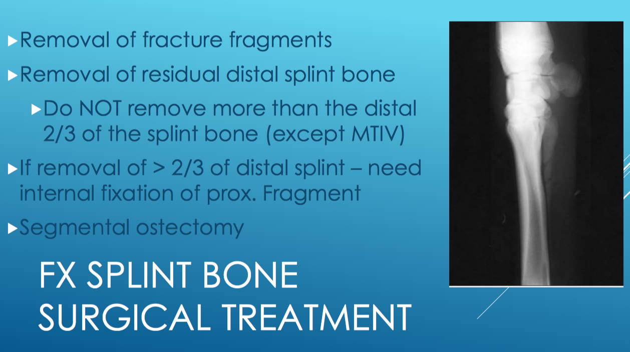 In cases of splint bone fracture, if you’re removing residual distal splint bone, it is important not to remove more than the distal 2/3 of the splint bone.