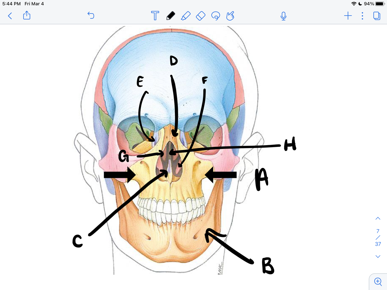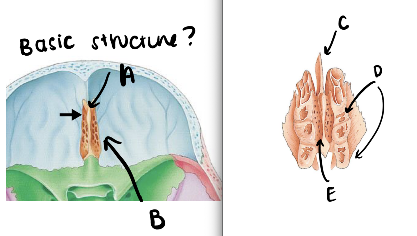 A. Maxillary B. Mandible C. Vomer D. Nasal E. Lacrimal F. Inferior nasal concha G. Middle nasal concha H. Perpendicular plate