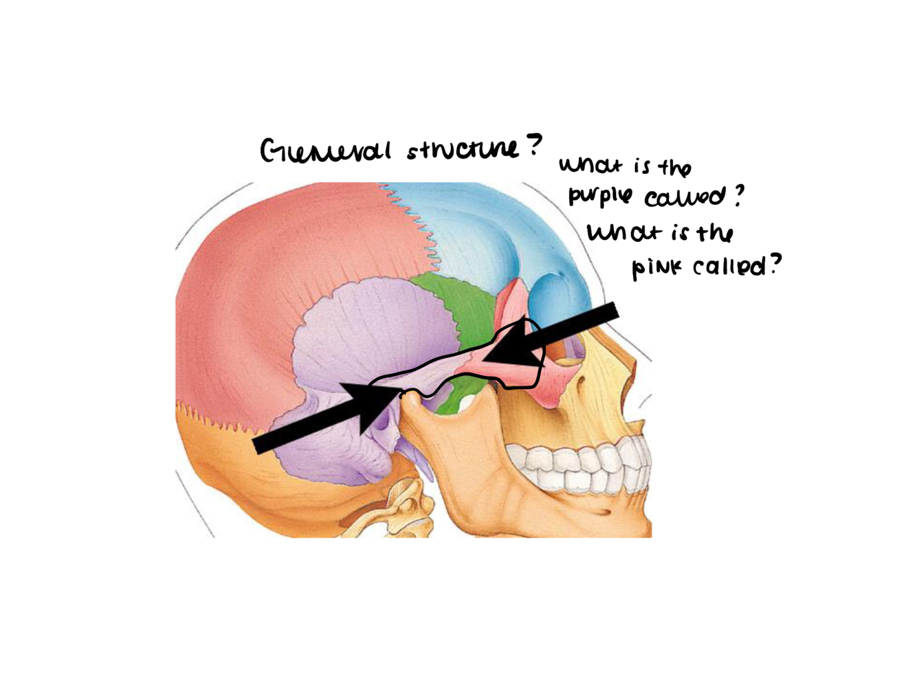 What is this structure called? What are the bones that make up this structure? What is the purple region called, and what is the pink region called?