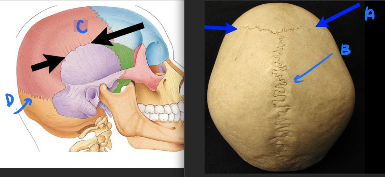 A. Parietal bone B. Frontal bone C. Occipital bone D. Temporal bone E. Sphenoid bone F. Ethmoid bone