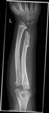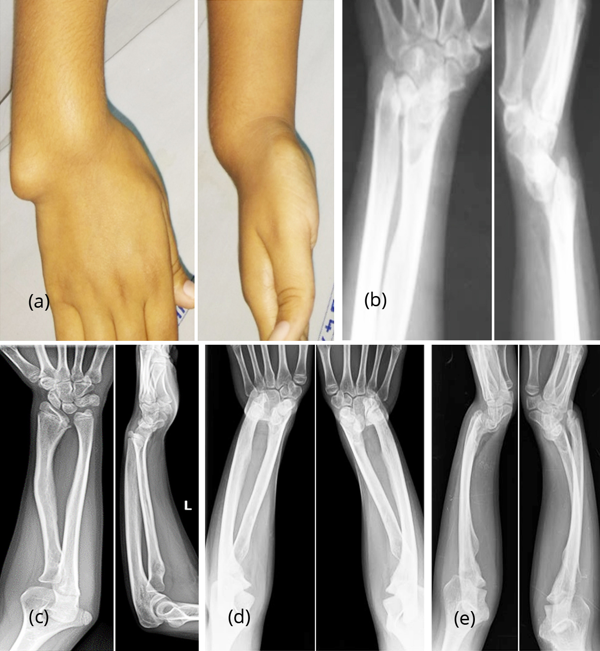 (e) enlarged and distorted ulnar head; and