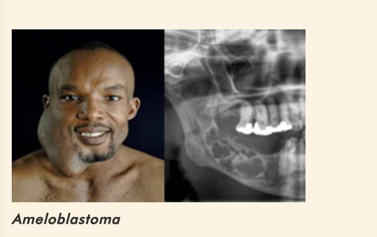 Painless swelling, gradual bone expansion, facial asymmetry, tooth displacement, and root resorption.
