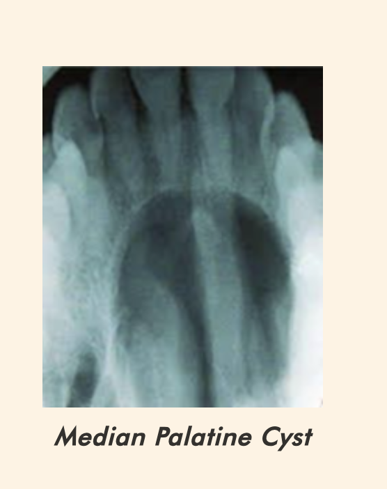 Heart-shaped radiolucency near the apices of maxillary central incisors.