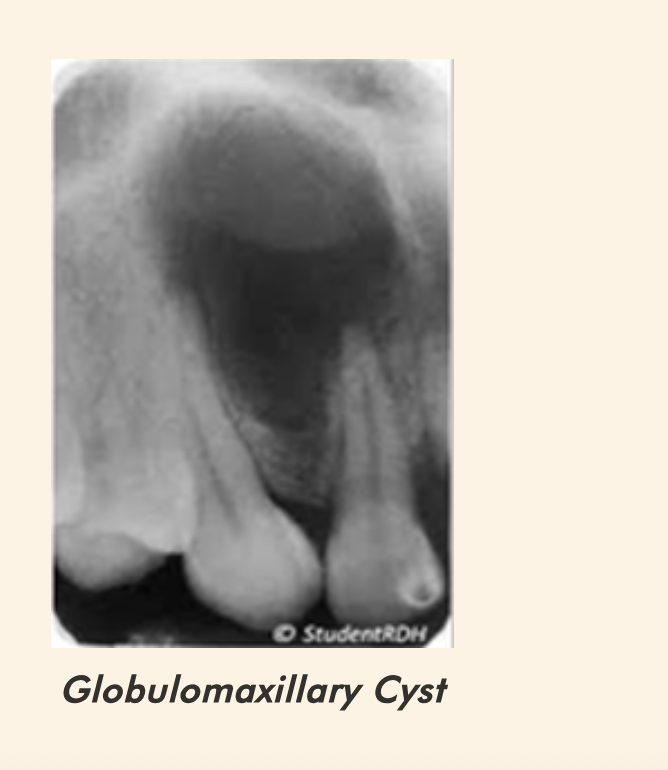 What is the classic radiographic appearance of a globulomaxillary cyst?