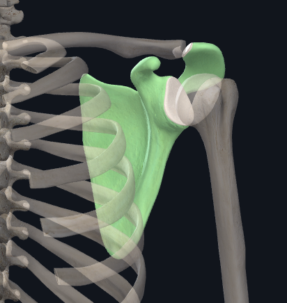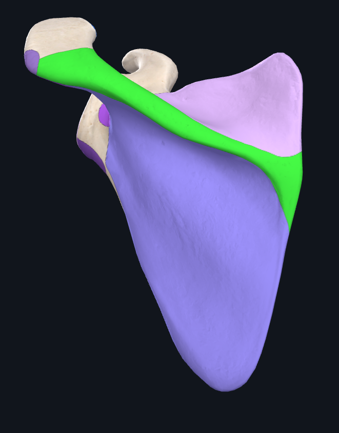 3) Infraspinous fossa - area below the spine of the scapula, it displays a covex shape. The infraspinatus originates here.