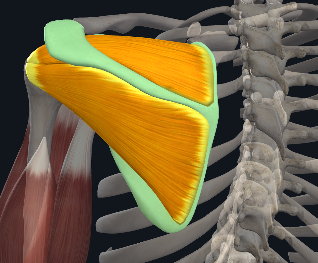 4) Supraspinous fossa - the area above the spine of the scapula - it is much smaller than the infraspinous fossa and more convex in shape. The supraspinatus muscle originates from this area.