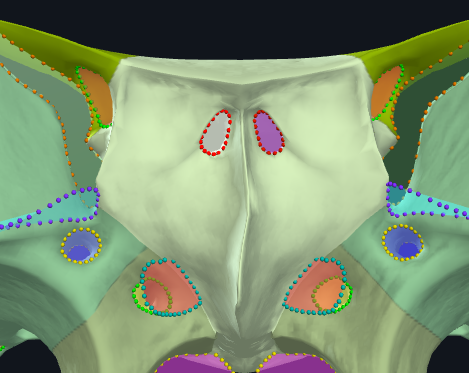Sphenoidal sinuses - separated by a sinus - body articulates with the ethmoid anteriorly where the sinuses open up into the nasal cavity. The opening of the sphenoidal sinus can be found on the anterior surface of the body.