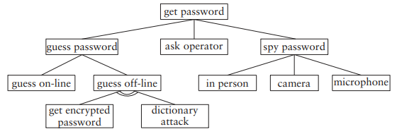 The figure gives a basic attack tree for the attack ‘get password’. A password can be obtained by guessing, or by tricking an operator to reveal it, or by spying on the user. Guessing could be on-line or off-line. For off-line guessing, the attacker needs the encrypted password and has to perform a dictionary attack. The attacker could spy on the victim in person (so-called shoulder surfing), direct a camera at the keyboard, or direct a microphone at the keyboard and distinguish by sound the keys being pressed