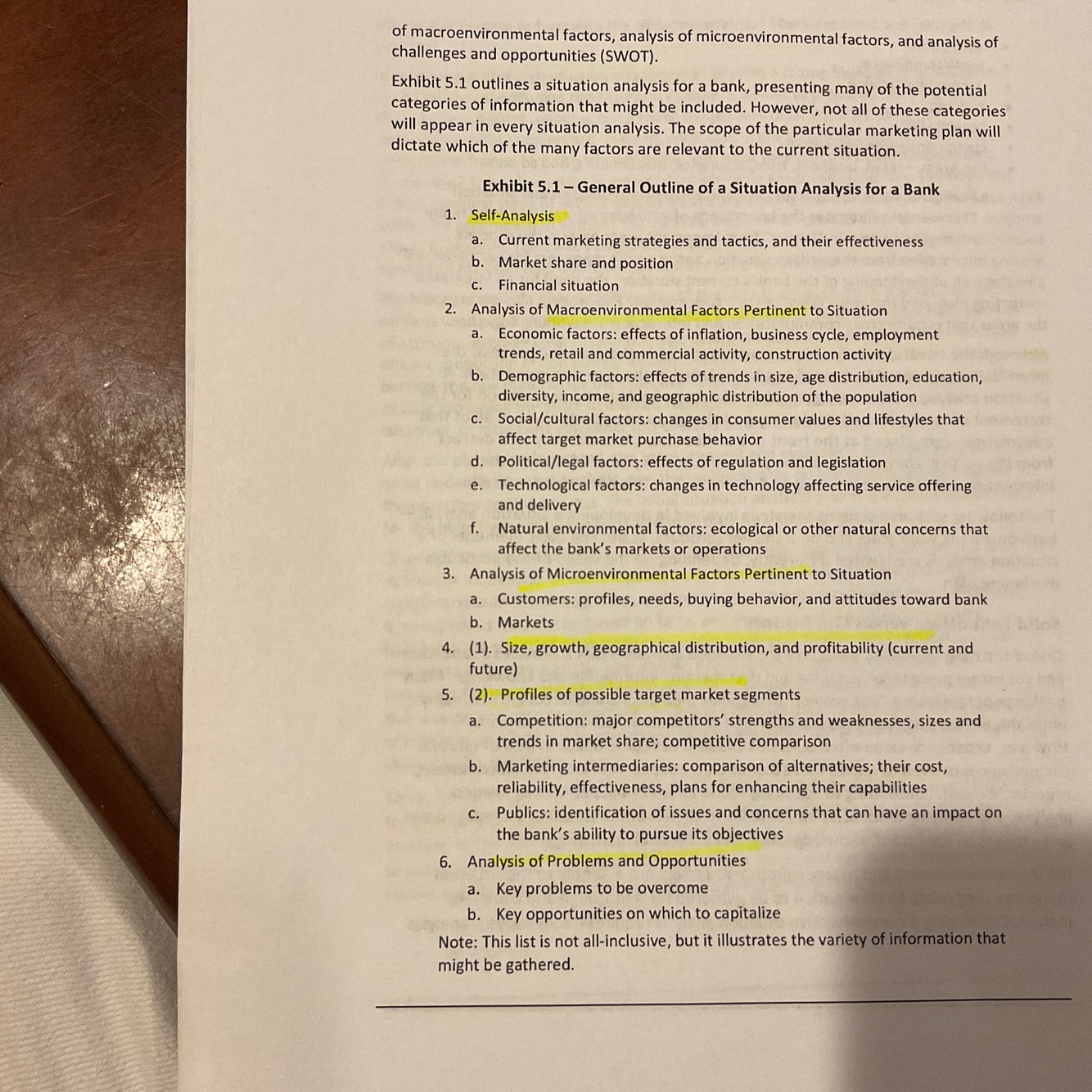 It involves gathering historical trends data on the bank and its competition; reviewing the markets and market segments in which the bank operates or would like to operate; and evaluating the external factors influencing the bank’s markets (macro and microenvironmental factors), internal factors (internal capabilities, balance sheet, departmental strengths). And finally understanding the perceptions of the customer and the markets have concerning the bank and its operation are necessary.