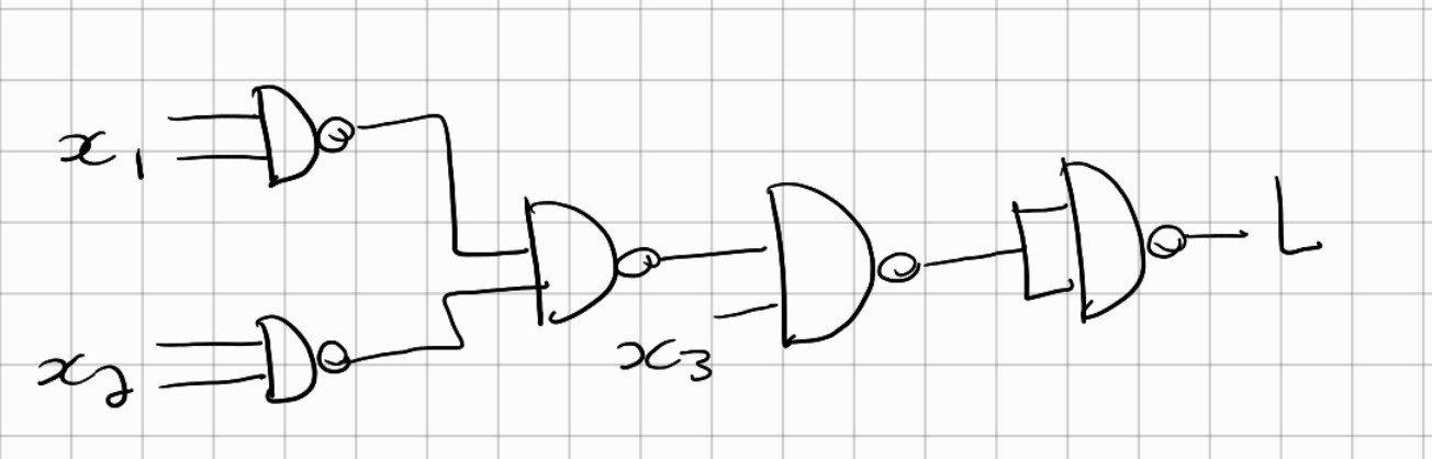 Construct a circuit using only NAND gates that implements the expression L(x1, x2, x3) = (x1 + x2) x3