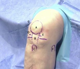 anteromedial 1 cm above joint and 1 cm medial to patellar ligament