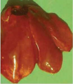 Liver often enlarged, mottled, with necroses of various size & marginal infarctions